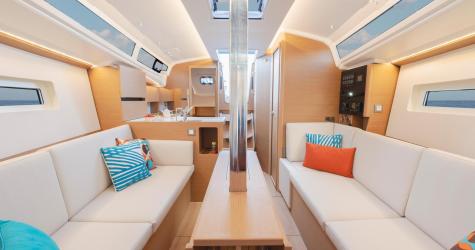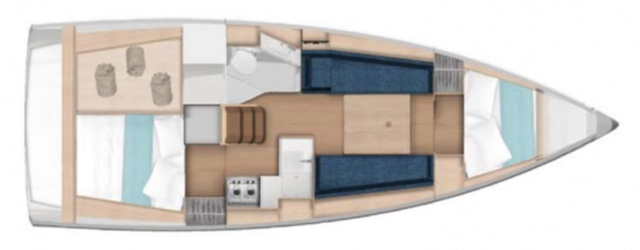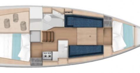 The Sun Odyssey 350 provides a single heads to port, a forepeak cabin with hatch onto the foredeck and one double stern cabin. Galley to Starboard and a chart table to port in front of the Heads with control panel, GPS, DSC VHF radio, EPIRB and CD/radio player.