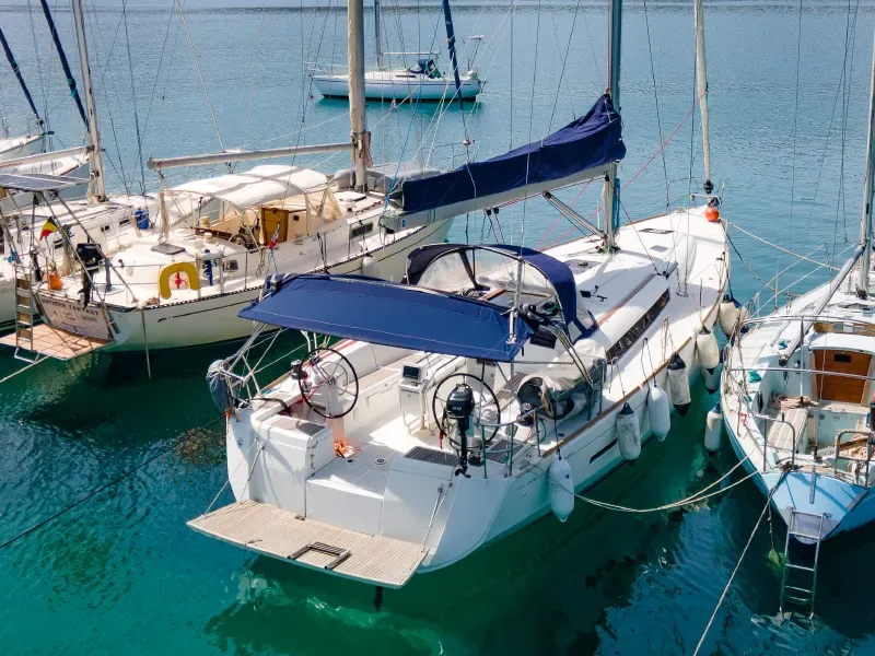 A very spacious 3 cabin 44ft cruising yacht with two double aft cabins, a further double berth cabin in the forpeak plus bunk cabin to port, 2 x Shower/WC and galley to starboard,